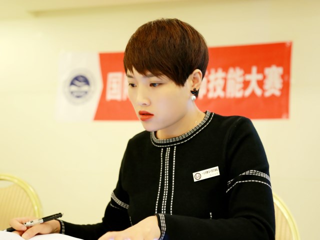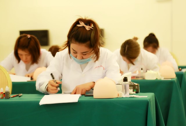 本次大赛的比赛项目分理论和眉眼唇实操,参赛选手紧张的比赛进行中,评委们赛场巡视